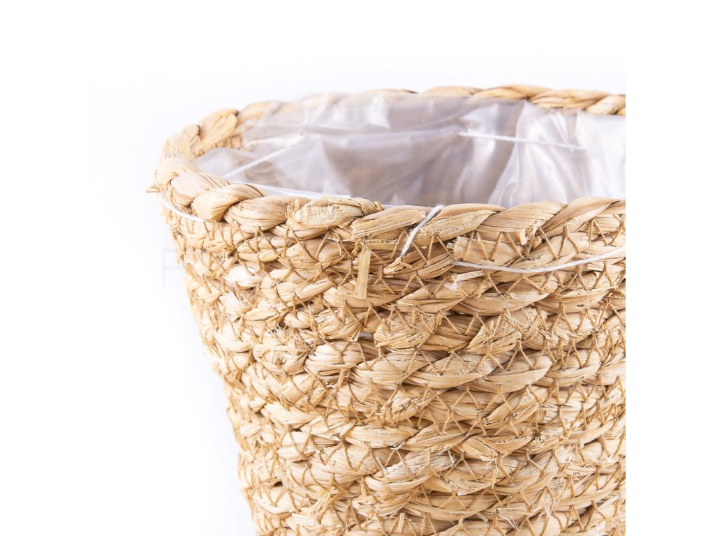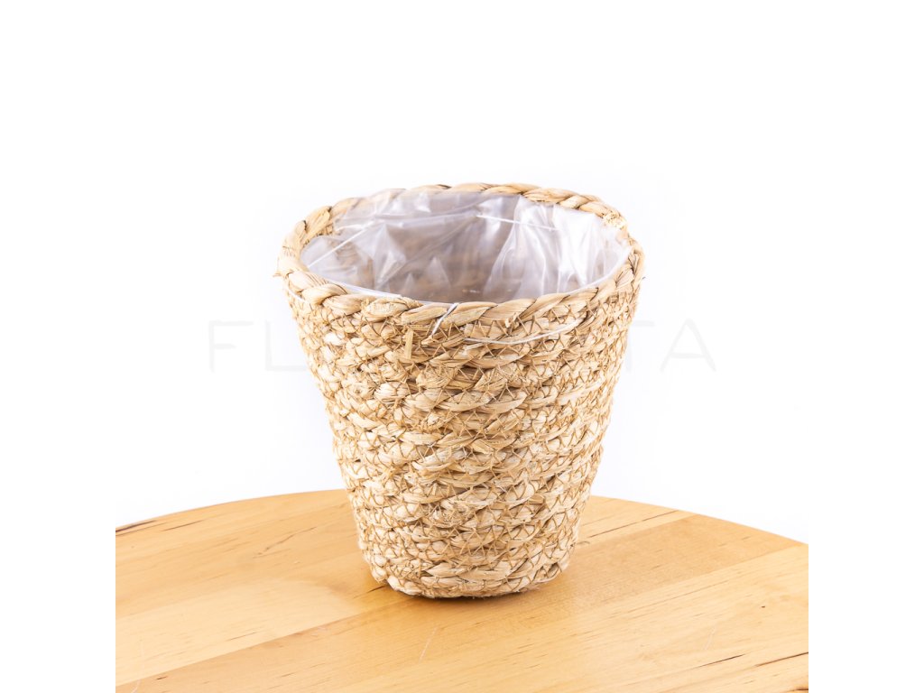 Obal na kvetináč z morskej trávy s vnútorným ochranným obalom proti pretečeniu. Vhodný na vnútorný kvetináč s max priemerom 9,5 cm.