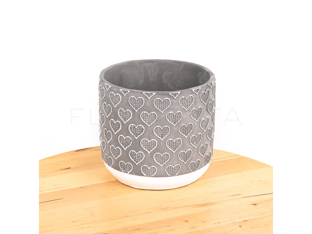 Keramický obal na kvetináč z popolavého šamotu so srdiečkovým 3D vzorom na sivobielom podklade. Vhodný na vnútorný kvetináč s max. priemerom 12 cm.